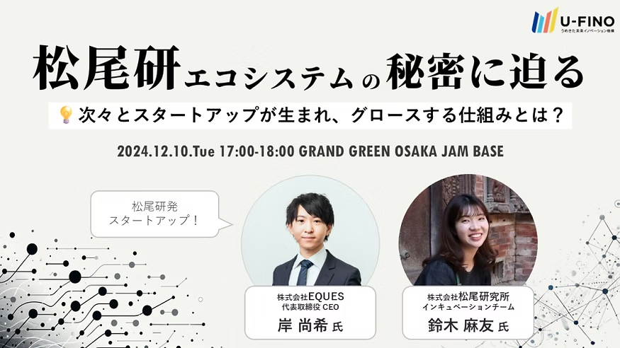 2024年12月10日(火)より開催される「Ecosystem Link #17 presented by It's Sta.」において、弊社代表が講演を行います <登壇のお知らせ> 2024年12月10日(火)より開催される「Ecosystem Link #17 presented by It's Sta.」において、弊社代表が講演を行います。 ■Ecosystem Link presented by It’s Sta.とは Ecosystem Link(エコシステムリンク)では、スタートアップ、事業会社の新規事業/オープンイノベーション担当者、金融機関、士業、行政、支援機関など、イノベーションに挑戦する方々が集い、情報や技術・知識等を共有し、自ら発信していくコミュニティであるIt's Sta.(イッツステーション:Innovators & Trailblazers Synergy Station)において、スタートアップ・エコシステムに関するセッションと注目のスタートアップのピッチを行います。 Session1では、「松尾研エコシステムの秘密に迫る~次々とスタートアップが生まれ、グロースする仕組みとは?~」と題して、松尾研発スタートアップおよび松尾研究所の方にお越しいただき、松尾研エコシステムの仕組みに迫ります。 Session2では8月以来の産学融合ミートアップDEEPTECH CAMPUSをKSIIとの共催で開催いたします。「ディープテックスタートアップの超成長のためにエコシステムに必要な革新とは?~脱・”プニコーン(punycorn)”!~」と題して、ディープテックスタートアップが中長期的にさらなる成長をするために必要な「M&A活性化」および「セカンダリー(ファンド)によるスケールアップの可能性」をテーマに議論します。スタートアップとの連携や共創をされたい方、ディープテックスタートアップに関心がある方はぜひご参加ください。 ■開催概要 Session1:松尾研エコシステムの秘密に迫る~次々とスタートアップが生まれ、グロースする仕組みとは?~ 日時:2024年12月10日(火)17:00-18:00 会場:同会場セミナーゾーン 主催:一般社団法人うめきた未来イノベーション機構(U-FINO) こんな方におすすめ:松尾研エコシステムに関心がある方、生成AI分野に関心がある方、スタートアップの成長支援をされている方 等 <プログラム(予定)> 17:00 オープニング 17:10 パネルディスカッション 18:00 交流会・名刺交換会 18:15 終了 お申し込みはこちら:https://ecosystemlink17.peatix.com/view 皆様のご参加を心よりお待ちしております。